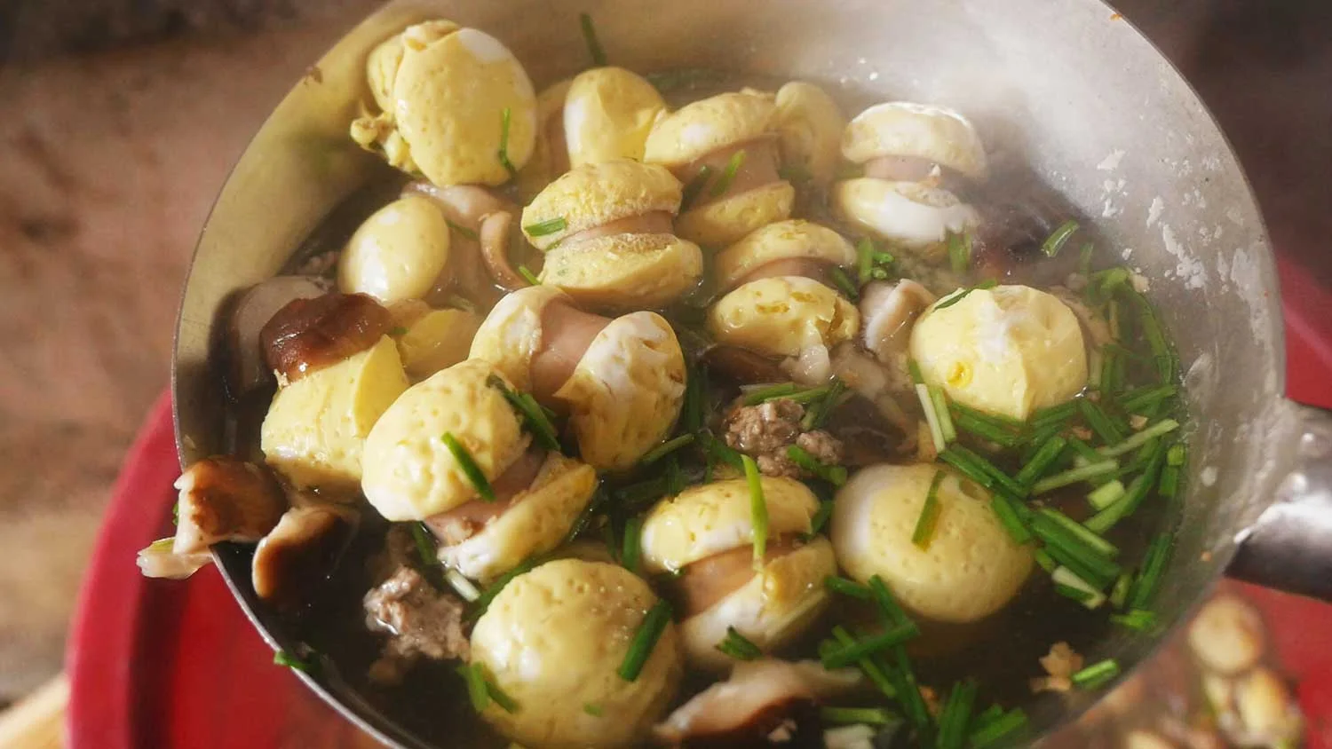 To prepare danchang 蛋肠, a beaten egg-chive mixture is funneled into sausage casings. The sausages are boiled until firm enough to be sliced into inch-long portions. These portions simmer in mushroom broth, where they blossom on either end of the cut casing.
